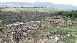 The town was defended by a basalt wall, forming a great rampart and fortified with buttresses, on the east and by the Mashavera valley on the north and northwest, going to the depth of 90 metres here. The southern part of the promontory was occupied by a citadel, of about 3,250 square metres. It was located inside the town wall, separated from the town by a special rampart which contains the only gate. The citadel contained a palace, bathhouse, and other structures. To the west, a 200 m-long clandestine tunnel, largely preserved to this day, led to the Mashavera river.[4]