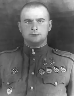 On 21 April 1943 he was awarded his first gold star, having been nominated for the title on the first day of the month for shooting down 15 enemy aircraft and flying 146 sorties. Soon on he received a second star on 24 August 1943 for raising his tally to 29 aerial victories.[3] By the end of the war he had executed a total of 282 sorties and shot down 50 enemy aircraft. His last aerial victory was a Bf 109 that he shot down over Meissen while flying an Airacobra. Throughout the war he flew missions on Yak-1, Curtiss P-40 Warhawk, and Bell P-39 Airacobra fighters; he scored his first victories on the Yak-1 and most on the Airacobra, but did not score any shootdowns on the P-40.[4]