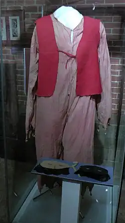 Some of the vestments used by the sectarians during the mysteries have also been preserved. These include a petticoat of white cotton cloth, a satin nightgown, a white dress with short sleeves cut off at the waist, three black masks decorated with lace, and a jester's costume with gold galloon and bells. They are all held in the collections of the Museum of the History of Religion.[64] After the trial, these items were transferred along with the documents to the Central Anti-Religious Museum in Moscow, and later, as a separate collection, they became part of the archive of Dr. Vladimir Bonch-Bruyevich, Doctor of Historical Sciences, at the Museum of the History of Religion in St. Petersburg.[24] A large number of photographs depicting sectarians are also part of the Museum of the History of Religion's collection. Schultz is featured in most of these photographs wearing women's clothing and a wig. Among his photographic portrayals are a dancer and a preacher behind a pulpit. According to Ilya Braude, some of these photographs were clearly pornographic in nature. Schultz's portraits of "gloomy figures with demonic features" — "spirits" worshipped by the sectarians[5] — were presented at the trial.