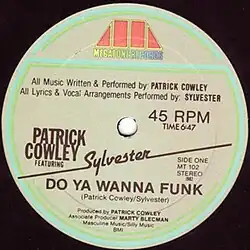 "Do Ya Wanna Funk" is a 1982 dance song recorded by American recording artists Sylvester and Patrick Cowley. It was produced by Cowley, who incidentally died the same year. The song was mostly successful in Europe, especially in Belgium, Finland and Norway, where it became a top-10 hit. It also reached the top 20 in the Netherlands and Switzerland, and made it to the top 30 in West Germany and Australia, and the top 40 in the United Kingdom.[3][4] The song was inspired by "I'm Your Jeanie",[5] a single by Jeanie Tracy, who was a background vocalist for Sylvester.[6] It was also featured in the film Trading Places (1983) and Argylle (2024).