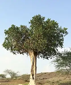 It is an much branched evergreen shrub or tree up to 8m. The bark is green to dark grey and patchy. Leaves are opposite, yellow to grey-green, thick, smooth, veins hardly seen, up to 7 cm long, tip usually notched. Flowers are small and white in colour. Fruits are ovoid to 2 cm, with 1 - 2 flat seeds. Paradoxically it produces better and more seeds in dry spell (under moisture stress conditions) than in normal times.[2]