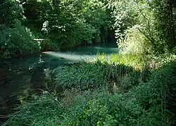 The Dobličica has its source in the eastern foothills of the Poljane Mountains (Slovene: Poljanska gora) at Lake Dobliče (Slovene: Dobličko jezero), which is 40 meters (130 ft) across and up to 10 meters (33 ft) deep. The bed of the lake is covered with large boulders, among which karst water flows from two depressions. A karst spring with a constant flow feeds the lake, with an outflow in a broad but shallow channel. The upper part of the stream bed is rocky mixed with sand, and the banks are loamy. Soon after the source, another spring adds its water to the flow from the lake. The channel is bordered by typical riverside vegetation and meanders through meadows before being joined by another stream, the Potok, and emptying into the Lahinja River at Črnomelj. The Dobličica and the Lahinja surround the old town center of Črnomelj on three sides.[1][2]