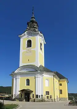 The local parish church is dedicated to Saint George and belongs to the Roman Catholic Diocese of Novo Mesto. It was built in 1777.[4]