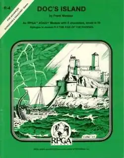 R-4 Doc's Island was written by Frank Mentzer, with art by Bob Walters, and published by TSR/RPGA in 1983 as a 16-page booklet with an outer folder.[1] The module was a limited edition, and was only available for purchase to RPGA members.[1] It was subsequently rewritten, and collected with the other modules from the R-series in I12 Egg of the Phoenix.[1]