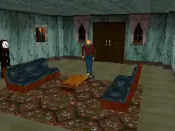 Other items for working out puzzles include weapons like a knife and a gun. However, the mansion in Doctor Hauzer features no combat or enemies and instead relies upon numerous traps and obstacles that can cause the player an instant game over.[3][4] These include floor pits in numerous areas, a room filled with swinging blades on pendulums, and a hallway containing a large, rolling boulder.[2] The player can freely switch to first-person and top-down (overhead) camera perspectives at any time.[2][3][4] These views have situational advantages over one another. For example, the first-person mode is useful for investigating objects and puzzle clues up close, while the overhead mode is better for surveying room layouts and jumping over floor gaps.[5][6]