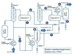 The doctor sweetening process is an industrial chemical process for converting mercaptans in sour gasoline into disulfides. Sulfur compounds darken gasoline, give it an offensive odor and increase toxic sulfur dioxide engine emissions.[1] However, this process only reduces the odor.