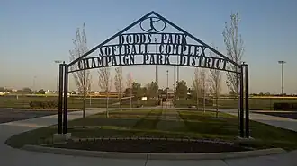 The "Tribute to Olympic Athletes" was created to honor those residents of Champaign County who have competed in the Olympics. To date 41 athletes are commemorated on the monument since the tribute's dedication on July 4, 1991.[4] The monument consists of several rising plateaus forming a walkway leading to a large granite gateway. Beyond the gateway a pedestal overlooking the playing fields in Dodds Park is inscribed with the names of those who have represented Champaign County in the Olympics.