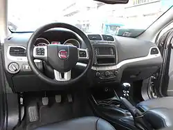 As a mid-size CUV, the Journey was available in five and seven passenger configurations and was noted for its overall packaging and seating flexibility—which included a front passenger seat with under-cushion storage and fold-flat capability; second-row for-aft sliding, reclining, fold-flat seating with an H-point 1.6 inches (40 mm) higher than the front row (aka theater seating); latching under-floor storage with removable bins; available twin booster seats and single-hand-operable third row access; available twin fold-flat third-row seats and an aft under-floor storage compartment.[8] Trim levels varied over model years, to include various options with entertainment/infotainment, cloth or heated leather seats and heated steering wheel as well. Additionally, rear doors opened to 90 degrees, rare for any offerings by the Big Three (automobile manufacturers).[8]