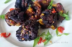 Dodo Ikire is a Yoruba traditional delicacy from Ikire in Osun State, Nigeria.[1][2] It was originally made from leftover plantain but today, people prepare it from fresh ingredients which are: over-ripe plantains, pepper, oil and salt. Dodo Ikire is black and round or conical in shape.