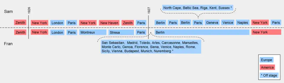 The novel includes detailed descriptions of Sam and Fran's tours across Europe. They leave for the Continent via steam liner from New York, landing first in England. They take in London and are invited by Major Clyde Lockert to join a weekend trip to the countryside. Later, after Lockert has made an indecent proposal to Fran, they depart for Paris, where she soon engages in a busy social life and Sam takes up sightseeing. When he decides to go back to America for his college reunion in New Haven, Fran spends the summer months on the Alpine lakes near Montreux and Stresa, where she has a romance with Arnold Israel. Once Sam has picked her up in Paris, they agree to continue their travels together, touring France, Italy, Spain, Austria, Hungary and Germany. Fran next falls in love with nobleman Kurt von Obersdorf in Berlin, and stays on with him while Sam criss-crosses Europe attempting to cope with the breakdown of his marriage. When he happens to run into Edith in Venice, she persuades him to accompany her on a visit to a village in the vicinity of Naples. Von Obersdorf calls off the marriage, and Sam joins Fran on her voyage back to New York. Three days later, he is back on the next ship to meet Edith in Paris.