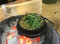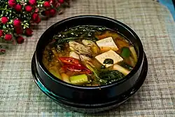 Doenjang-jjigae (Korean: 된장찌개; pronounced [twen.dʑaŋ.t͈ɕi.ɡɛ]), referred to in English as soybean paste stew, is a Korean traditional jjigae (stew-type dish), made from the primary ingredient of doenjang (soybean paste), and additional optional ingredients of vegetables, seafood, and meat.[2] It is one of the most iconic and popular traditional dishes in Korean cuisine, and is often eaten regularly regardless of occasion or time of day. Doenjang-jjigae was initially made with home-made doenjang; however, due to extensive industrialisation of soybean paste, households and restaurants nowadays use factory-made doenjang instead as their ingredient. From traditional to modern Korean cuisine, doenjang has become one of the most frequently used jang (sauce/paste). It is claimed as a national dish.[3]