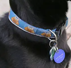 A dog collar is a piece of material put around the neck of a dog. A collar may be used for restraint, identification, fashion, protection, or training (although some aversive training collars are illegal in many countries [1][2]). Identification tags and medical information are often placed on dog collars.[3] Collars are often used in conjunction with a leash for restraining a dog. Collars can be traumatic to the trachea if the dog pulls against the restraint of the leash, causing severe pressure to the neck. Use of a harness instead of a collar may be beneficial for dogs prone to tracheitis or those with a collapsed trachea. Conversely, dog breeds with slender necks or smaller heads may easily slip out of collars that are too loose. This can be avoided by using a martingale dog collar which tightens to distribute pressure around the neck when training the dog not to pull.[4] Any style of dog collar must be properly fitted to ensure safety and collars should not be worn when the dog is unattended.[5]