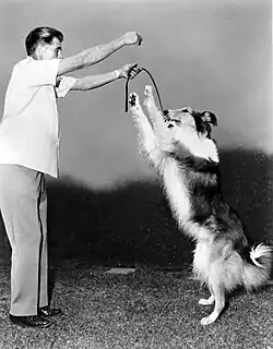 In 1935, the American Kennel Club began obedience trials, and in the following years popular magazines raised public awareness of the benefits of having a trained pet dog, and of the recreational possibilities of dog training as a hobby.[29] After WWII, the increasing complexities of suburban living demanded that for a pet dog's own protection and its owner's convenience, the dog should be obedient. William Koehler had served as principal trainer at the War Dog Training Center, in California, and after the war became chief trainer for the Orange Empire Dog Club—at the time, the largest dog club in the United States—instructor for a number of breed clubs, and a dog trainer for the Walt Disney Studios.[30]