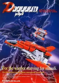 Dogyuun[a] is a 1992 vertically scrolling shooter arcade video game developed and published by Toaplan. Set on the colonized fictional planet of Dino in the future, where an alien race of metallic robots have invaded a police communication center and held its inhabitants as hostages, players assume the role of two fighter pilots taking control of the Sylfers bomber space fighter crafts in a revenge attempt to overthrow the invaders and free the surviving colonists after their comrade is killed by one of them during a reconnaissance assignment.