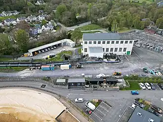 Dolgarrog hydro-electric power station was commissioned in 1907 by the Aluminium Corporation of Dolgarrog to supply electricity to its adjacent aluminium smelting plant.[1] The smelting of the mineral bauxite to make aluminium is an energy intensive process requiring a large amount of electricity.[2] The availability of cheap hydro-electric power was therefore attractive. The construction of the power station was sanctioned under the provisions of the North Wales Electric Power Act 1904. Water was drawn from Llyn Cowlyd and Llyn Eigiau, via a system of leats and tunnels.[3] There are two 48-inch (1.22 m) diameter pipelines providing a working head of 830 feet (253 m) and 1130 feet (344 m).[3]