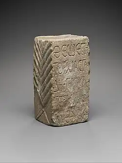 The temple entrance is in the south. The building had a columned courtyard with two altars. Behind it were two cellae. The temple was therefore dedicated to two deities. Various rooms were arranged around the courtyard, some of them had benches along the walls. Remnants of wall paintings were also found in one room. Various inscriptions were discovered in and around the temple. One cellae was dedicated to little-known god Turmasgade. Second cellae was for Jupiter Dolichenus, several dedications for whom were found in the temple.[2][1] Another room was dedicated for unnamed goddess, probably Juno Dolichena.[1] The temple was built by units of Roman army near 211 AD,[2] and was in use until 256 AD.[1] It was used mainly by Roman soldiers stationed in the city. Soldiers left several inscriptions that mentions "centurio princeps of a vexillation of IV (Scythia) and XVI Flavia Firma, a vexillation of Cohors II Paphlagonum with the titles 'Galliana Volusiana', a cohors equitata with the same titles, and Julius Julianus, of A.D. 251".[2]