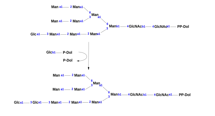 2. ^ Runge KW, Robbins PW (November 1986). "A new yeast mutation in the glucosylation steps of the asparagine-linked glycosylation pathway. Formation of a novel asparagine-linked oligosaccharide containing two glucose residues". The Journal of Biological Chemistry. 261 (33): 15582–90. doi:10.1016/S0021-9258(18)66754-7. PMID 3536907.