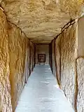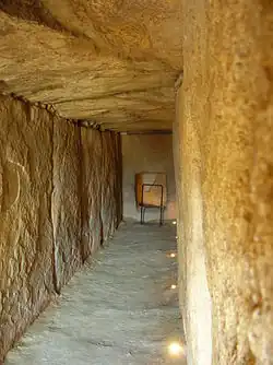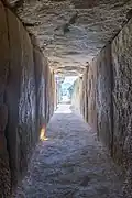 The left and right sides of the corridor appear to have consisted originally of sixteen slabs each; fourteen remain on the left and 15 on the right. Five larger slabs are intact in the roof, and there are fragments of two others; it would appear that three or four more have been entirely lost. The end of the corridor is a single large monolith with a square hole near its center. This and three other monoliths surround the chamber[3][7] There is a notable difference between the stones on the sides and those of the roof: the former is much more carefully worked and fit perfectly into the recesses made in the stones of the entrance and the floor.