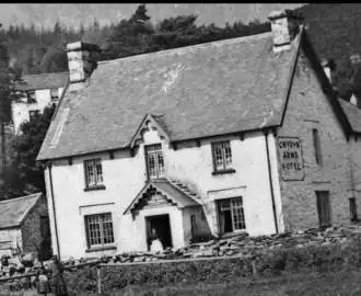 The Lledr Valley contains a number of earthworks. On the side of Garnedd Pen y Bont to the north of Blaenau Dolwyddelan are a pair of huts dating from the Iron Age or Romano-British era.[12] Blaenau Dolwyddelan also contains Ty'n y Ddol, a medieval long hut 'of national importance.'[13] All three sites are scheduled monuments. A boundary bank marks part of the community's border with Beddgelert in the west, across the Bwlch y Rhediad pass between Carnedd y Cribau and Cerrig Cochion. It may originally have marked the boundary of lands belonging to Aberconwy Abbey, which are mentioned in a charter of c. 1198.[14]