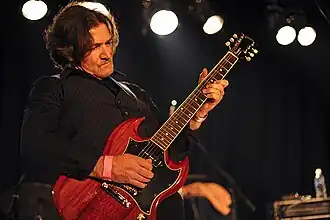 Dom Mariani & the Majestic Kelp were formed as an instrumental group in 2003. Mariani reunited with former Go-Starts drummer Robbie Scorer, and new associates Killian Albrecht on guitar and Stu Loasby on bass guitar. Price described their sound as "cool surf guitar/postmodern lounge instrumental".[15] They released their debut album, Underwater Casino in July. In 2005 Mariani was inducted into the WAMIA Hall of Fame.[6] In August that year he curated a 2× CD compilation album, Popsided Guitar: Anthology 1984–2004, which featured material from The Stems, The Someloves, DM3, The Stoneage Hearts and The Majestic Kelp.[7][34] The cover depicts Mariani holding his Rickenbacker 330 Fireglo six-string guitar, which he used for The Stems and DM3.[35] Mariani put together a new line-up to promote the retrospective under the banner of Dom Mariani & The Rippled Souls. Featuring Kelp cohort Stu Loasby on bass, Kevin Borruso on guitar and Shaun Sibbes on drums. The newly christened 4 piece toured throughout Europe and Japan in early 2006 as well as a successful eastern states tour. The Rippled Souls also opened for John Fogerty and Teenage Fanclub. Following on from the tour, The Majestic Kelp's second album, Music to Chase Cars By, was recorded in Perth and mixed in San Diego by Mark Neill (The Black Keys, The Palominos, Old 97's) at Soil of the South Studios and issued in 2006. The group's line-up was expanded with the addition of two new members, Toby Gosfield on keyboards and Billy Rogers on saxophone.
