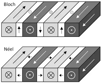A Néel wall is a narrow transition region between magnetic domains, named after the French physicist Louis Néel. In the Néel wall, the magnetization smoothly rotates from the direction of magnetization within the first domain to the direction of magnetization within the second. In contrast to Bloch walls, the magnetization rotates about a line that is orthogonal to the normal of the domain wall. In other words, it rotates such that it points out of the domain wall plane in a 3D system. It consists of a core with fast varying rotation, where the magnetization points are nearly orthogonal to the two domains, and two tails where the rotation logarithmically decays. Néel walls are the common magnetic domain wall type in very thin films, where the exchange length is very large compared to the thickness. Without magnetic anisotropy Néel walls would spread across the whole volume.