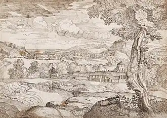 Many drawings long considered by Titian are now thought to be by Domenico, and attribution of many is still disputed, as some earlier drawings are disputed between his father Giulio, Titian, and Giorgione. Drawings have also been reattributed from Domenico to Giulio Campagnola.[5] He began by closely following the style of his father and Titian in producing landscapes with figures, but produced larger numbers, and made them directly for sale, so that it is largely through him that this influential typology became widely known. According to James Byam Shaw:"In later drawings, Campagnola debased this style of landscape into a kind of facile mannerism; nevertheless he furnished inspiration for Italian draughtsmen for generations to come, including ... Agostino and Annibale Carracci, and Domenichino and Grimaldi later still."[6]