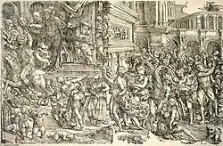 One engraving appears to have been begun by his father and completed by Domenico, perhaps after his father died. He fell out seriously with Titian, perhaps as a result of the sharp practice which Peter Dreyer has discovered in recent years; it is thought to be Domenico who took very faint counter-proof impressions of some Titian woodcuts, which were then worked over in ink and passed off as Titian's preliminary drawings.[4] This may well have played a part in bringing to an end Titian's first period of serious interest in making prints based on his work; it was to be some decades before he began collaborating with Cornelius Cort in producing engravings. None of Campagnola's engravings are direct renderings of paintings by Titian, but many are similar in composition, though very different in handling, even allowing for the difference in medium.