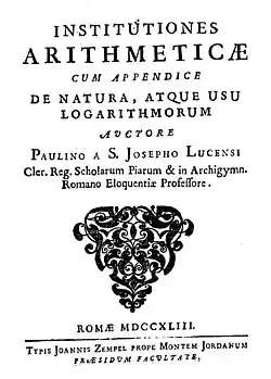 - Institutiones arithmeticæ cum appendice de natura, atque usu logarithmorum (in Latin). Roma: Giovanni Zempel. 1743.