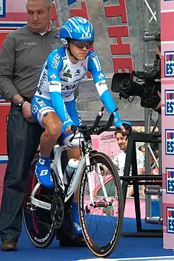Later that year, he sailed to victory in stage 8 of the Giro d'Italia, attacking on the slopes of the Colle Molella, 7 kilometres (4.3 mi) away from the finish. His nearest pursuant, Spaniard Beñat Intxausti of Movistar Team, completed the stage with a 23 seconds deficit on Pozzovivo.[29] He finished the Giro eighth overall, being always very competitive in the mountain stages. In June, Pozzovivo prevailed in the queen stage of the 2.1 rated Tour of Slovenia, a 219 kilometres (136 mi) course peppered with climbs. Pozzovivo broke away with Janez Brajkovič of Astana and somewhat surprisingly, beat Brajkovič in the sprint.[30] With that operation, he took the overall classification leader's jersey thanks to a six-second lead over Brajkovič, but lost it the next day in the individual time trial, where Brajkovič bested him by ten seconds. Pozzovivo had to settle for the second place of the Tour.[31]