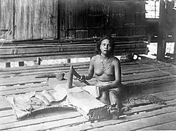 In Philippine anitism, ti were commonly used by babaylan (female shamans) when conducting mediumship or healing rituals. A common belief in Filipino cultures is that the plant has the innate ability to host spirits. Among the Ifugao people of Northern Luzon, it is planted around terraces and communities to drive away evil spirits as well as mark boundaries of cultivated fields. The red leaves are believed to be attractive to spirits and is worn during important rituals as part of the headdresses and tucked into armbands. In the past, it was also worn during ceremonial dances called bangibang, which was performed by both men and women for warriors who died in battle or through violent means. They are also used to decorate ritual objects.[110][111][112][113] Among the Palaw'an people, it is planted in burial grounds to prevent the dead from becoming malevolent spirits.[114]