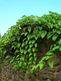 The giant taro (Alocasia macrorrhizos) was originally domesticated in the Philippines, but are known from wild specimens to early Austronesians in Taiwan. From the Philippines, they spread outwards to the rest of Island Southeast Asia and eastward to Oceania where it became one of the staple crops of Pacific Islanders.[18][19] They are one of the four main species of aroids (taros) cultivated by Austronesians primarily as a source of starch, the others being Amorphophallus paeoniifolius, Colocasia esculenta, and Cyrtosperma merkusii, each with multiple cultivated varieties. Their leaves and stems are also edible if cooked thoroughly, though this is rarely done for giant taro as it contains higher amounts of raphides which cause itching.[20][21]