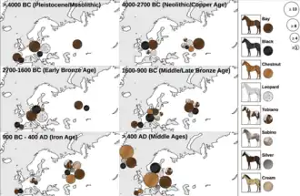 - ^ Wutke S, Benecke N, Sandoval-Castellanos E, Döhle H, et al. (7 December 2016). "Spotted phenotypes in horses lost attractiveness in the Middle Ages". Scientific Reports. 6: 38548. Bibcode:2016NatSR...638548W. doi:10.1038/srep38548. PMC 5141471. PMID 27924839.