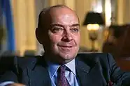 Domingo Felipe Cavallo (born July 21, 1946) is an Argentine economist and politician. Between 1991 and 1996, he was the Minister of Economy during Carlos Menem's presidency. He is known for implementing the convertibility plan, which established a pseudo-currency board with the United States dollar and allowed the dollar to be used for legal contracts. This brought the inflation rate down from over 1,300% in 1990 to less than 20% in 1992 and nearly to zero during the rest of the 1990s.[1] He implemented pro-market reforms which included privatizations of state enterprises. Productivity per hour worked during his five-years as minister of Menem increased by more than 100%.[2] In 2001, he was the economy minister for nine months during the 1998–2002 Argentine great depression. During a bank run, he implemented a restriction on cash withdrawing, known as corralito. This was followed by the December 2001 riots in Argentina and the fall of Fernando de la Rúa as president.[3]