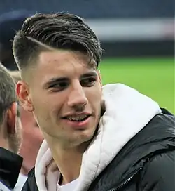 In the 2022–23 Bundesliga season, Szoboszlai again totalled 31 appearances and 6 goals.[23] He scored his first goal of the season in a 3–0 victory against Borussia Dortmund on 10 September 2022.[24] On 27 January 2023, he scored a double against VfB Stuttgart to secure a 2–1 victory at the Red Bull Arena on the 18th matchday.[25] He later scored the third goal in a surprise 3–1 win over Bayern Munich at the Allianz Arena on 20 May on the 33rd matchday.[26][27] On 3 June, he scored the second goal in a 2–0 win against Eintracht Frankfurt in the DFB-Pokal final at the Olympiastadion in Berlin.[28][29]