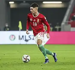Szoboszlai received his first call-up to the senior Hungary squad for the friendly against Russia and a 2018 FIFA World Cup qualifier against Andorra in June 2017.[56] On 21 March 2019, Szoboszlai made his first appearance for the Hungarian senior team as a 54th-minute substitute for László Kleinheisler in a UEFA Euro 2020 qualifier against Slovakia.[57] Three days later, he made his first start in a 2–1 win over Croatia.[58]