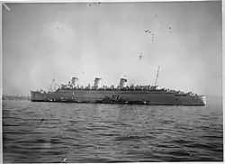 The total number of troops on the convoy was nearly 15,700, and Government representatives and a large number of citizens bade them farewell with a public ceremony when the convoy sailed on 19 December. The cruisers HMAS Sydney, HMAS Canberra and HMNZS Leander escorted the convoy,[5] which called at Fremantle before reaching Trincomalee and Colombo in Ceylon in January 1941, whence Dominion Monarch continued with Convoy US 8/1 to Egypt.[19] She again collided with a coaster, this time off Perim in the Bab-el-Mandeb at the entrance to the Red Sea.[5] She sustained only minor damage, continued through the Suez Canal, and reached Port Said on 29 January. There she narrowly avoided being hit in an air raid[5] before leaving two days later.[16]