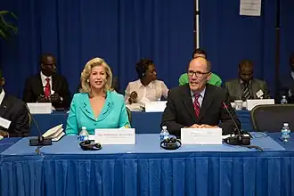 Dominique Ouattara is a member of the Organization of African First Ladies against HIV/AIDS (OAFLA) and attended various meetings, including the 7th African Conference on Sexual Health and Rights in Accra, Ghana in February 2016.[25] She is also a member of the African Synergy Association.