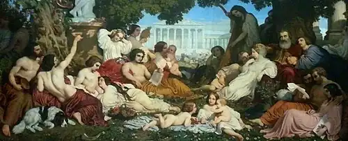 Papety became a close friend of François Sabatier-Ungher, an art critic who was interested in antiquities. Together, they took a trip to Greece in 1846. He visited all twenty-three monasteries on Mount Athos, made hundreds of drawings and, the following year, published a combination travelogue and report in the Revue des deux Mondes titled Les peintures byzantines et les couvents de l'Athos; influenced by the ideas of Charles Fourier. Those ideas also inspired his best known painting: Le Rêve du Bonheur (Dream of Happiness).[1]