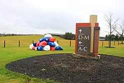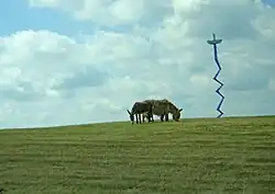 The western portion of the campus features a distinctive blue lightning bolt-shaped cell tower, which was installed in 1997. AirTouch Cellular (now Verizon Wireless) proposed and financed the tower. The tower was designed by Birkerts, following negotiations about its aesthetics between Monaghan and AirTouch. The 165-foot (50 m) tower is equipped with a lighting system that illuminates its guy wires at night.[19][20]