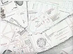 The earliest fresco and mosaic remnants of the Domus Valeriorum on the Caelian hill date to the original construction of the large domus, which lasted approximately between 50 and 30 B.C.[3] The domus was owned by Valerii Poplicolæ, and was severely damaged by the fire of A.D. 27 during the reign of Tiberius and another fire in A.D. 64 under Nero.[4] Two major building phases - the first in opus latericium and the second in opus vittatum - have been identified.[5] The latter phase of construction focused on two areas, with the easternmost possessing thermal functions.[6] The building likely extended towards the current Basilica of Santo Stefano Rotondo, with the gardens lying towards Via Sant'Erasmo.[6] A significant portion of ruins, consisting of frescoes, stuccos, a mosaic-floored corridor and a viridarium, were uncovered in 2005 and dated to the 2nd century A.D.[3][6]