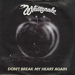 "Don't Break My Heart Again" is a song by the English rock band Whitesnake from their 1981 studio album Come an' Get It. Written by vocalist David Coverdale, the song was inspired by the breakdown of his first marriage.[3] The guitar solo performed by Bernie Marsden was recorded on the first take. Despite numerous attempts to top it, Marsden eventually conceded and agreed to use the first take.[4] Guitarist Doug Aldrich (who played with the band from 2003 to 2014) later named "Don't Break My Heart Again" one of his favourite Whitesnake songs.[5]