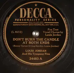 "Don't Burn the Candle at Both Ends" is a song written by Benny Carter, Irving Gordon, and Louis Jordan. It was performed by Louis Jordan and his Tympany Five, recorded in December 1947 and released on the Decca label (catalog no. 24483-A).[1] The "B" side of the record was "We Can't Agree".[2]