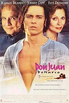 Don Juan DeMarco is a 1994 American romantic comedy-drama film starring Johnny Depp as John Arnold DeMarco, a man who believes himself to be Don Juan, the greatest lover in the world. Clad in a cape and domino mask, DeMarco undergoes psychiatric treatment with Marlon Brando's character, Dr. Jack Mickler, to cure him of his apparent delusion. But the psychiatric sessions have an unexpected effect on the psychiatric staff, some of whom find themselves inspired by DeMarco's delusion; the most profoundly affected is Dr. Mickler himself, who rekindles the romance in his complacent marriage.