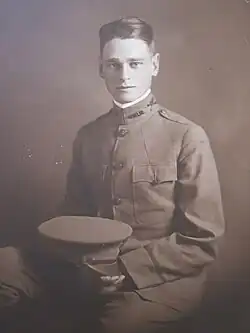 After the entry of the United States into the First World War, Dr. Fullerton trained with a number of other Princeton alumni at Fort Myer.[8] He served as a 2nd Lieutenant in the 313th Field Artillery whose six batteries were equipped with the famous French 75s.[9] The unit participated in the Meuse-Argonne Offensive during which it was engaged in combat without rest or relief for 47 days and suffered 164 casualties, more than 11% of its soldiers.[10] While serving with Battery A, three of Fullerton's men were killed on 14 October 1918 near Nantillois when a German shell hit their gun.[11] While serving with Battery E two of his men were killed on 1 November 1918 by shell fragments in the fight near the Grande Carrée Ferme, north of Bantheville.[12]