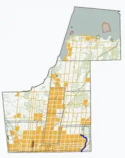 No longer known by the BGCR name, the route meanders north, slowly edging east towards Reesor Road and now surrounded by undeveloped greenspace.[4] It encounters Highway 7, north of which it becomes a divided roadway travelling on the eastern edge of Cornell as well as parallel to and alongside Reesor Road. Approaching and intersecting 16th Avenue, the road makes a broad sweeping curve northwest, continuing to serve as the boundary of urban development in Markham.[3] It narrows to a two lane road, with adjacent land along the northern side prepared for future northbound lanes, before encountering Ninth Line again.[4] Quickly curving north then east, sandwiched between the neighbourhood of Greenborough and Little Rouge Creek, the route makes a final curve north to end at Major Mackenzie Drive on the northern edge of urban development in eastern Markham.[3]