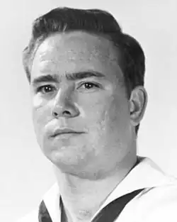 For conspicuous gallantry and intrepidity at the risk of his life and beyond the call of duty while serving as a HC2c. with Company M, in connection with operations against enemy aggressor forces. During the afternoon hours, Company M was moving to join the remainder of the 3d Battalion in Quang Tri Province. After treating and evacuating 2 heat casualties, HC2c. Ballard was returning to his platoon from the evacuation landing zone when the company was ambushed by a North Vietnamese Army unit employing automatic weapons and mortars, and sustained numerous casualties. Observing a wounded marine, HC2c. Ballard unhesitatingly moved across the fire swept terrain to the injured man and swiftly rendered medical assistance to his comrade. HC2c. Ballard then directed 4 marines to carry the casualty to a position of relative safety. As the 4 men prepared to move the wounded marine, an enemy soldier suddenly left his concealed position and, after hurling a hand grenade which landed near the casualty, commenced firing upon the small group of men. Instantly shouting a warning to the marines, HC2c. Ballard fearlessly threw himself upon the lethal explosive device to protect his comrades from the deadly blast. When the grenade failed to detonate, he calmly arose from his dangerous position and resolutely continued his determined efforts in treating other marine casualties. HC2c. Ballard's heroic actions and selfless concern for the welfare of his companions served to inspire all who observed him and prevented possible injury or death to his fellow marines. His courage, daring initiative, and unwavering devotion to duty in the face of extreme personal danger, sustain and enhance the finest traditions of the U.S. Naval Service.[11]
