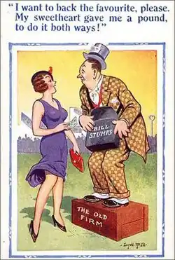 The cards mostly feature an array of attractive young women, fat old ladies, drunken middle-aged men, honeymoon couples and vicars.[1] He has been called 'the king of the saucy postcard', and his work is collected and appreciated for his artistic skill, power of social observation and earthy sense of humour. Even at the height of his fame he earned only three guineas a design,[2] but by the 2000s his original artwork could fetch thousands of pounds.
