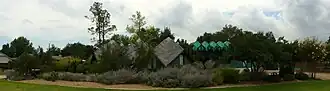 The house, designed by Bruce Goff and constructed in 1957, features steep hipped roofs over interlocking square areas, with skylights. The interior is partitioned by folding wood partitions. A studio with a screened porch on its roof is connected by a walkway over a reflecting pool.[3]: 9