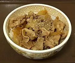 Gyūdon (牛丼; literally 'beef bowl'), is a Japanese dish consisting of a bowl of rice topped with beef and onion simmered in a mildly sweet sauce flavored with dashi (fish and seaweed stock), soy sauce and mirin (sweet rice wine). It also often includes shirataki noodles, and is sometimes topped with a raw egg or a soft poached egg (onsen tamago).