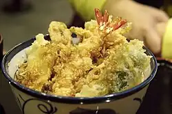 Tendon () consists of tempura on a bowl of rice. The name "tendon" is an abbreviation of tempura (天ぷら or 天麩羅) and donburi ().